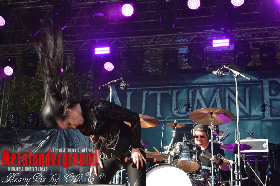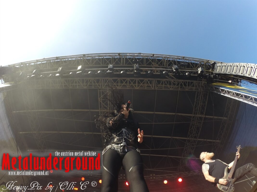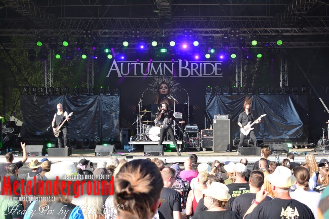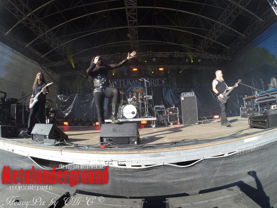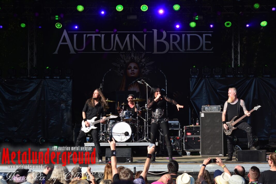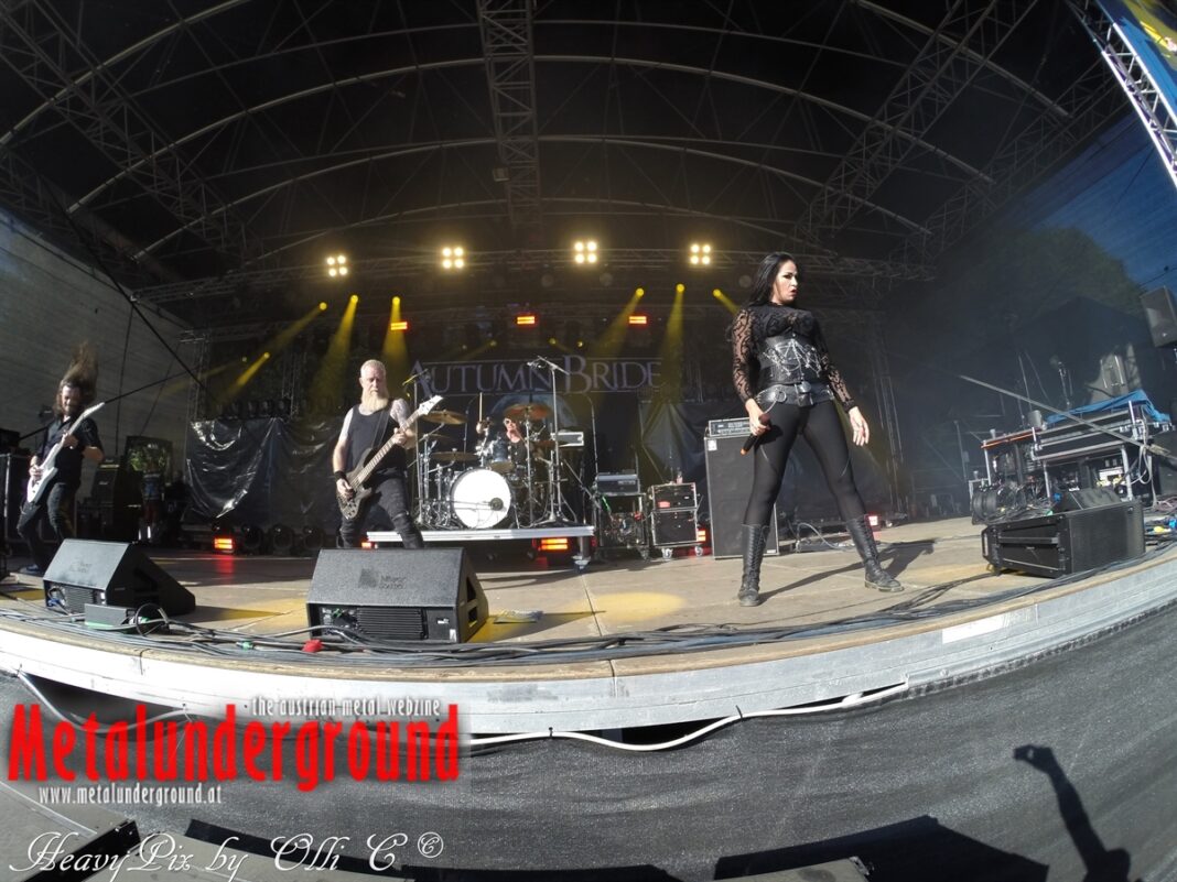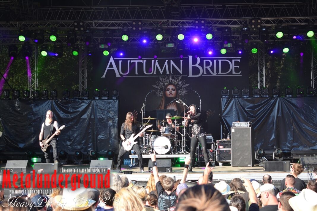 Es sind gefühlte 40 Grad Celsius und die brennende Hitze war fast unerträglich, jedoch ließen es sich die Metalheads trotz tropischen Temperaturen die Stimmung nicht verderben und feierten die female frontet Metal Band aus Wien ordentlich ab. Mit einem Set von 40 Minuten boten AUTUMN BRIDE eine fette Show. Eindeutig merkte man, dass die Band Spaß auf der Bühne hatte, wobei die Partylaune quasi auf das Publikum abfärbte. Es sind nicht nur Songs aus dem aktuellem Album „Bed Time Stories“ die AUTUMN BRIDE zum Besten gaben. Natürlich durften auch ihre Klassiker aus dem Debutalbum nicht fehlen und das Publikum ging bei „Guardian Angel“ voll ab. Leider war dieser Auftritt auch der letzte von mit ihrem Bassisten Ken, da dieser die Band verlassen wird.