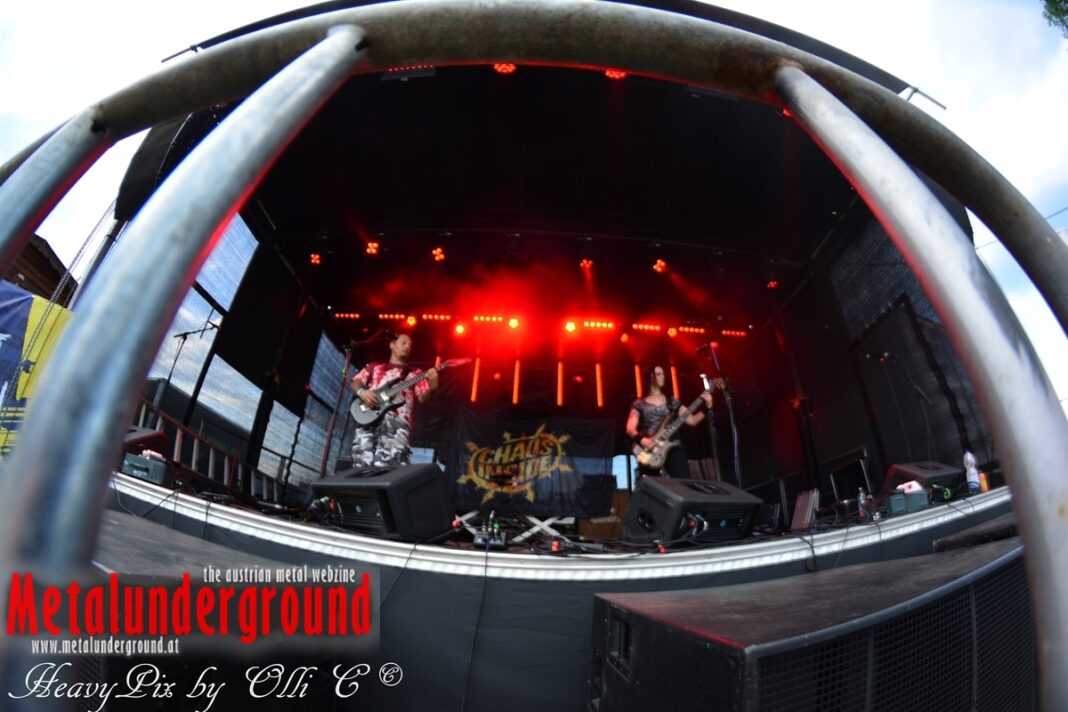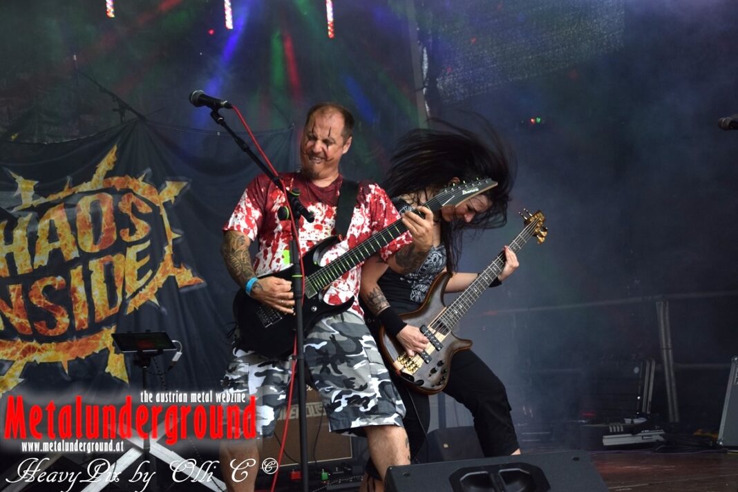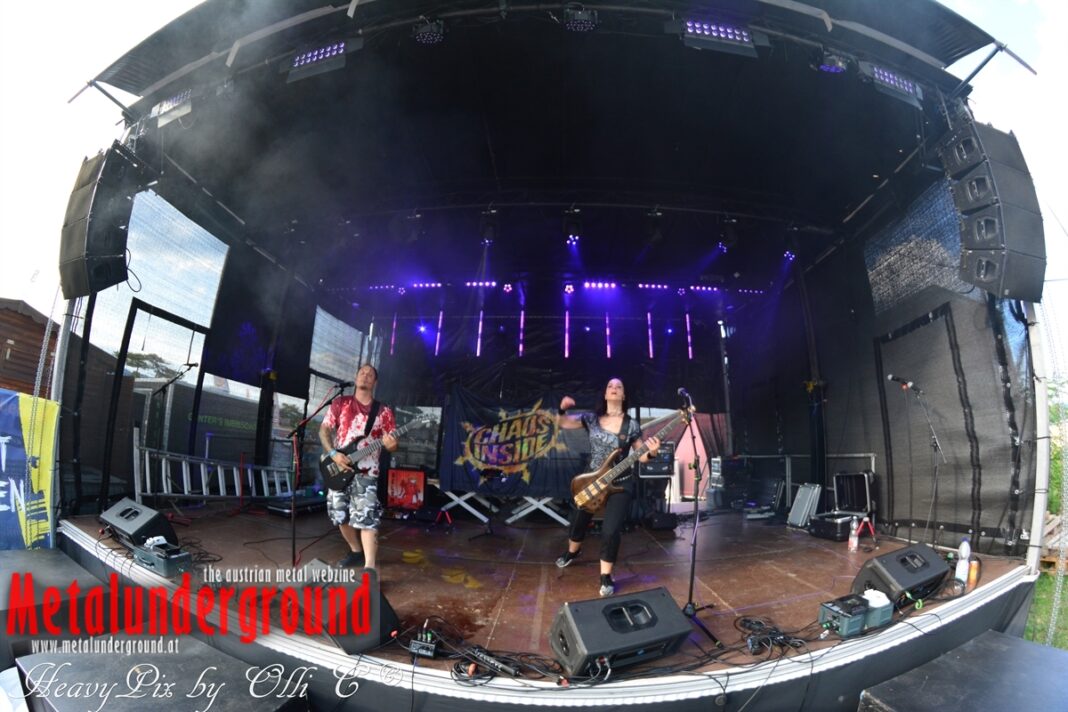 Eine Stunde nach Einlass eröffnete das Prog Metal Due CHAOS INSIDE den „Heavy Abend“. Klar, wenn schon meine heimische Lieblingsprog- Metalband am Set ist, muss man von Anfang an, trotz enormer Hitze dabei sein.