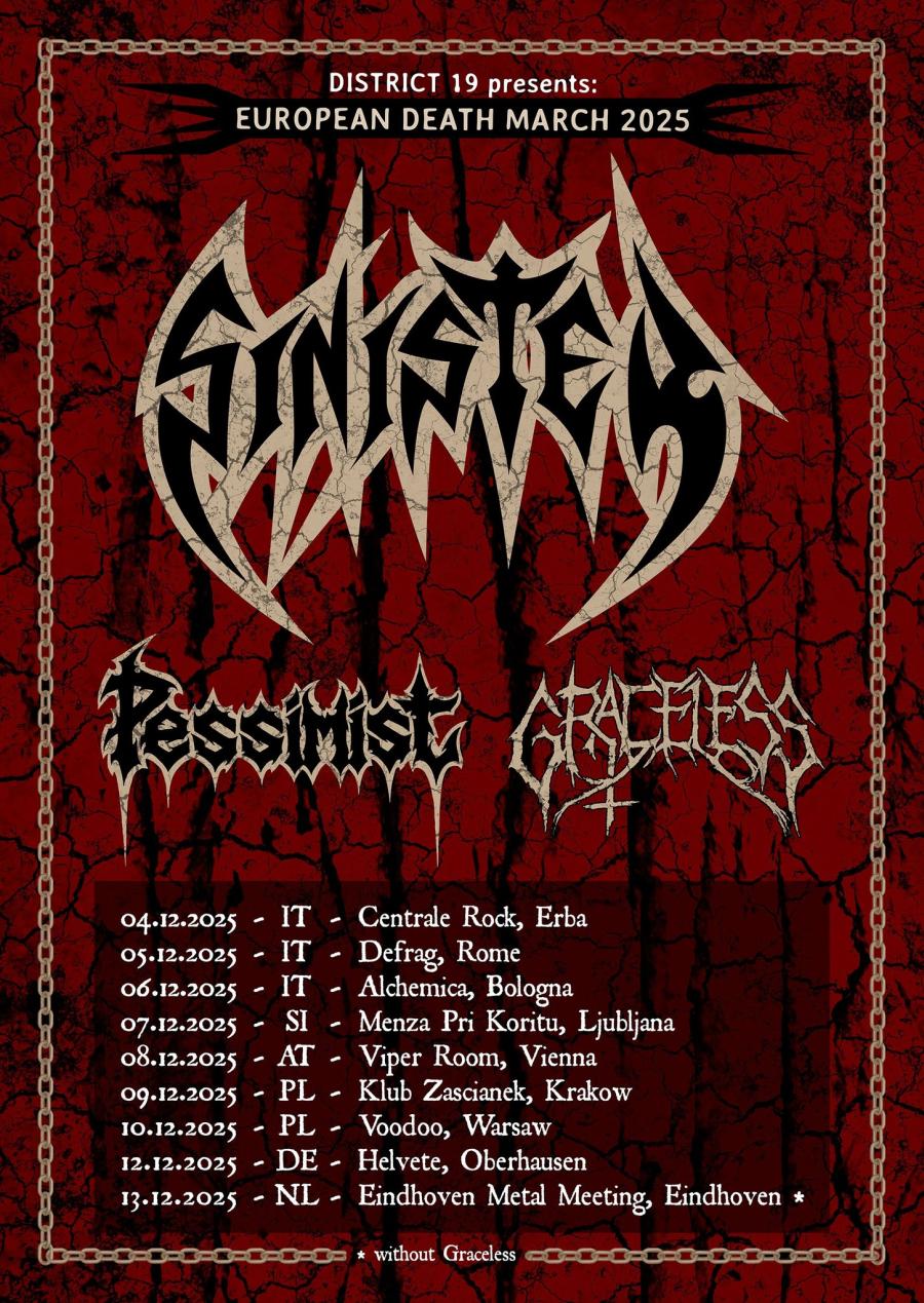 Nieselregen an einem Montagabend in Wien – für Metalheads jedoch stand im Viper Room ein mit Spannung erwarteter Termin an. Drei gewichtige Namen der Szene machten im Rahmen der passend betitelten „EUROPEAN DEATH MARCH 2025“ Station: GRACELESS, PESSIMIST und SINISTER. Ein weiteres starkes Konzert aus der inzwischen beeindruckenden Liste von TON-Music Productions.