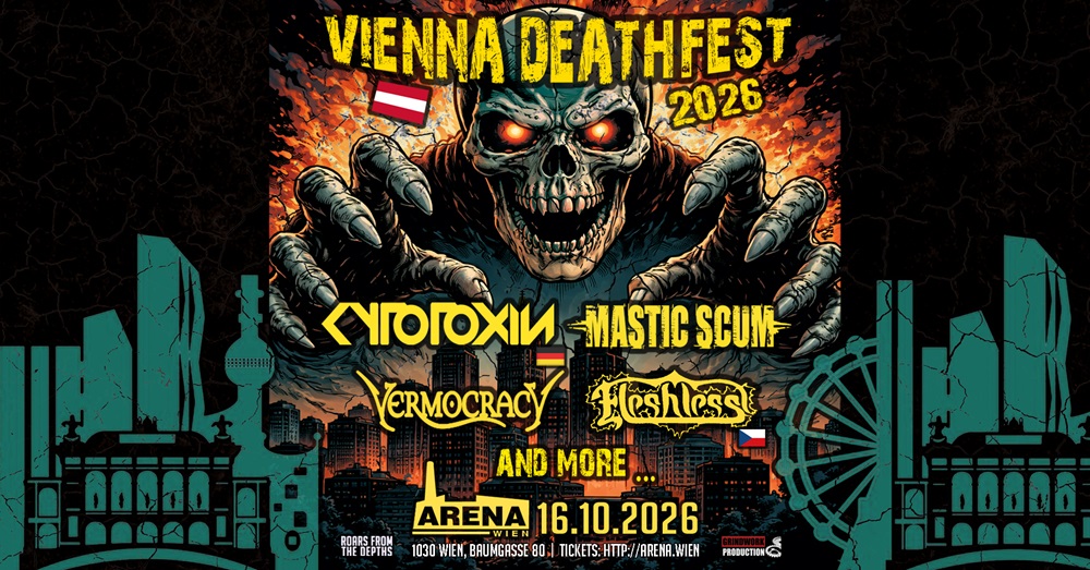 Die Veranstalter von ROARS FROM THE DEPTHS, GRINDWORK PRODUCTION und der Arena Wien haben etwas Neues für den österreichischen Underground auf die Beine gestellt: das VIENNA DEATHFEST! Die erste Ausgabe wird am Freitag, 16.10.2026, in der Arena stattfinden. Das Line Up wird aus internationalen Bands (CYTOTOXIN, FLESHLESS) und lokalen Szene-Größen (MASTIC SCUM, VERMOCRACY) bestehen – es ist aber noch nicht vollständig!